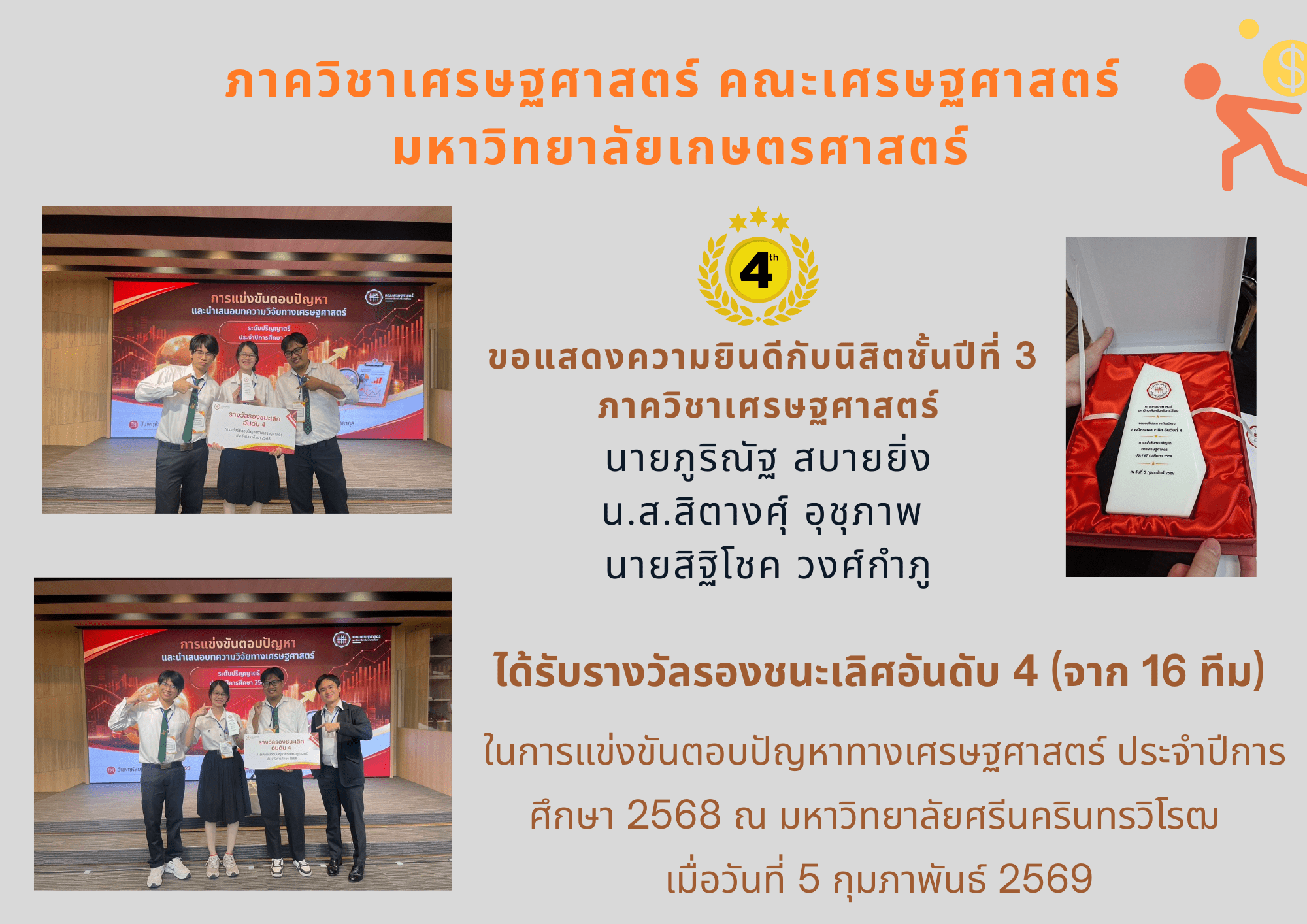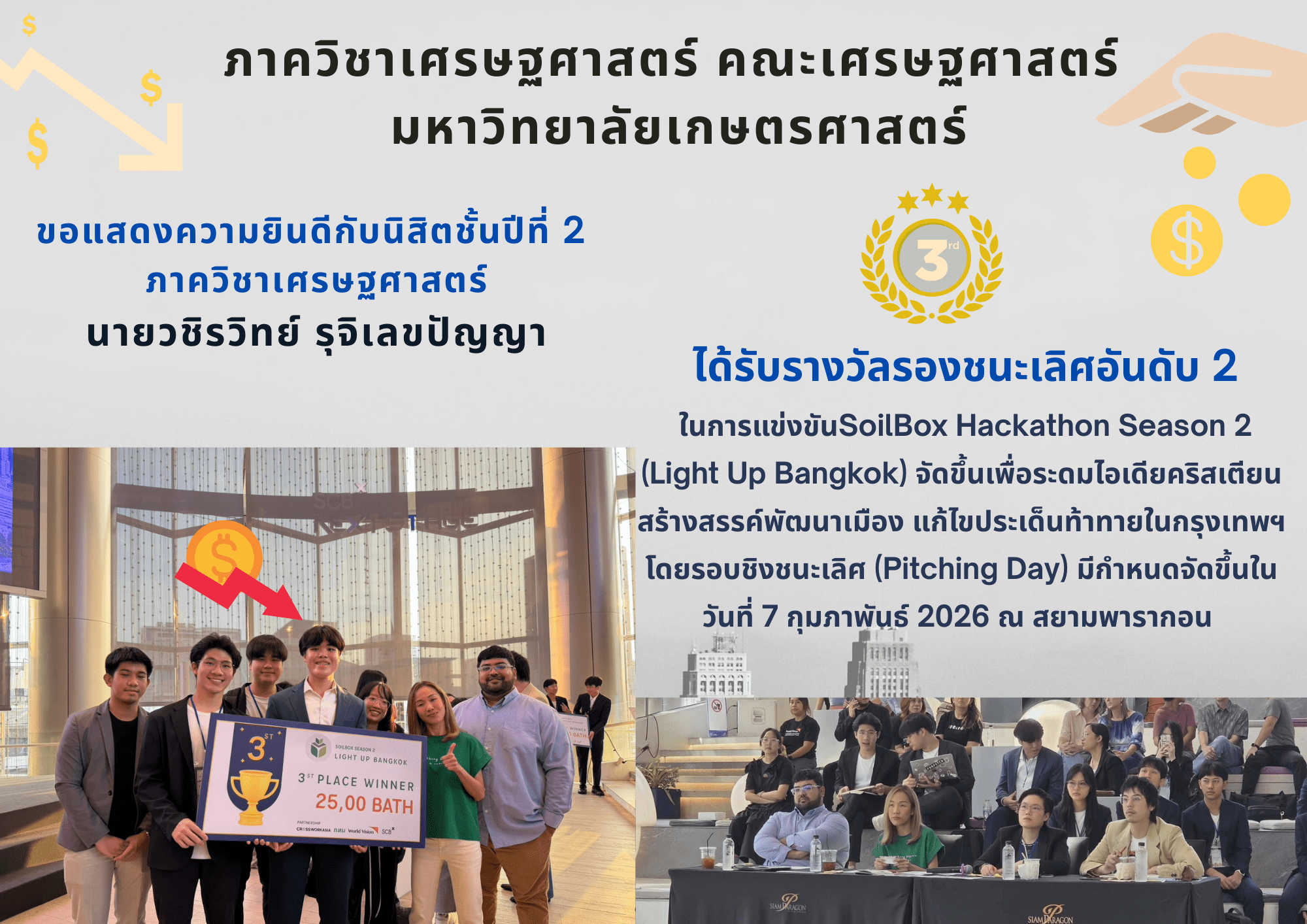 ภาควิชาเศรษฐศาสตร์ คณะเศรษฐศาสตร์ ขอแสดงความยินดีกับนิสิตชั้นปีที่ 2 นายวชิรวิทย์ รุจิเลขปัญญา ภาคภาษาอังกฤษ ได้รับรางวัลรองชนะเลิศอันดับ 2